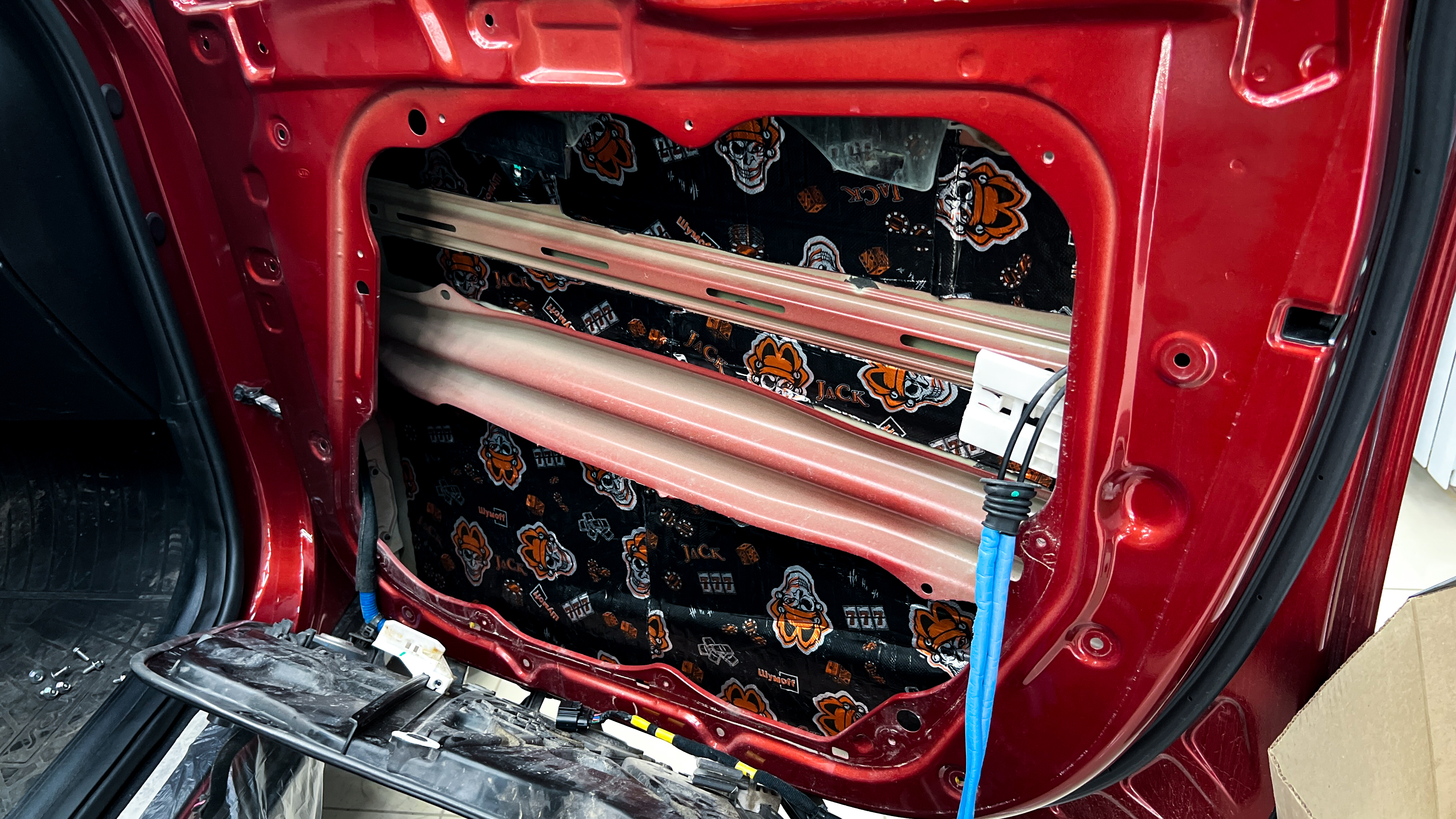 Для второго слоя на технологические отверстия используем так же Шумофф Jack. Этот слой помимо еще одного барьера для внешнего шума позволит раскрыть потенциал акустической системы, установленной в дверях.