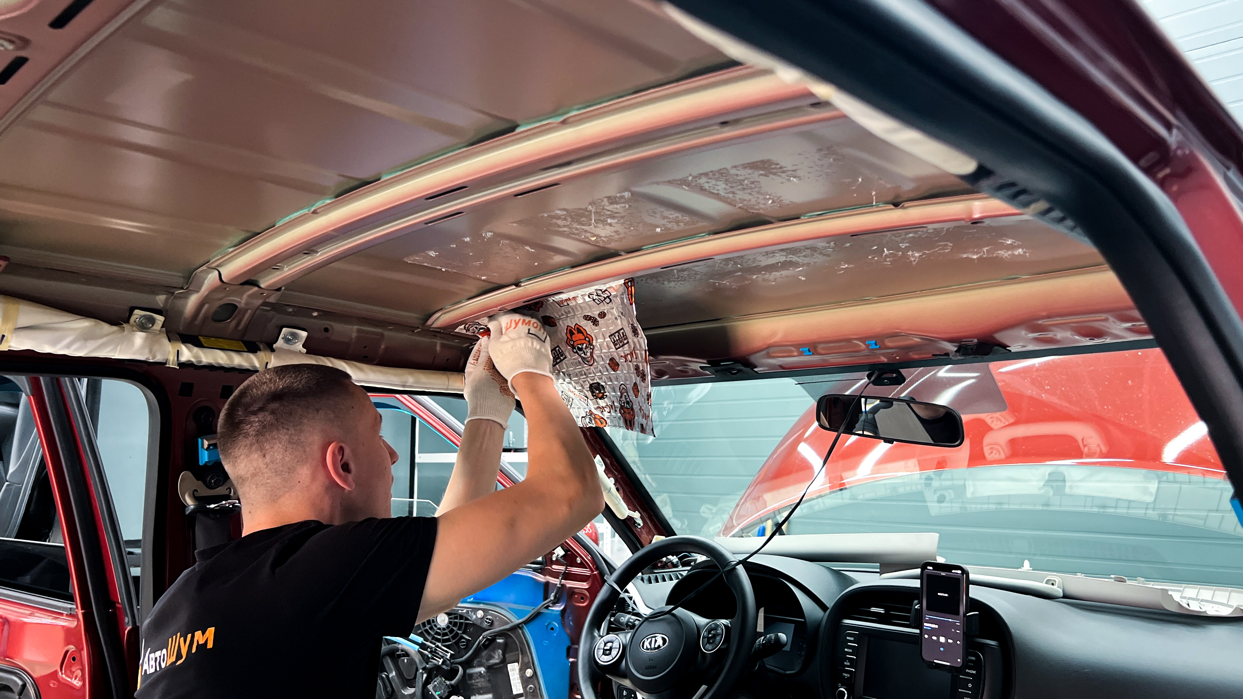 Шумоизоляция крыши виброизоляция крыши Киа Соул Поверх виброизоляции клеим шумопоглотитель Шумофф Герметон 7. Второй слой значительно погасит все средние и высокие частоты.