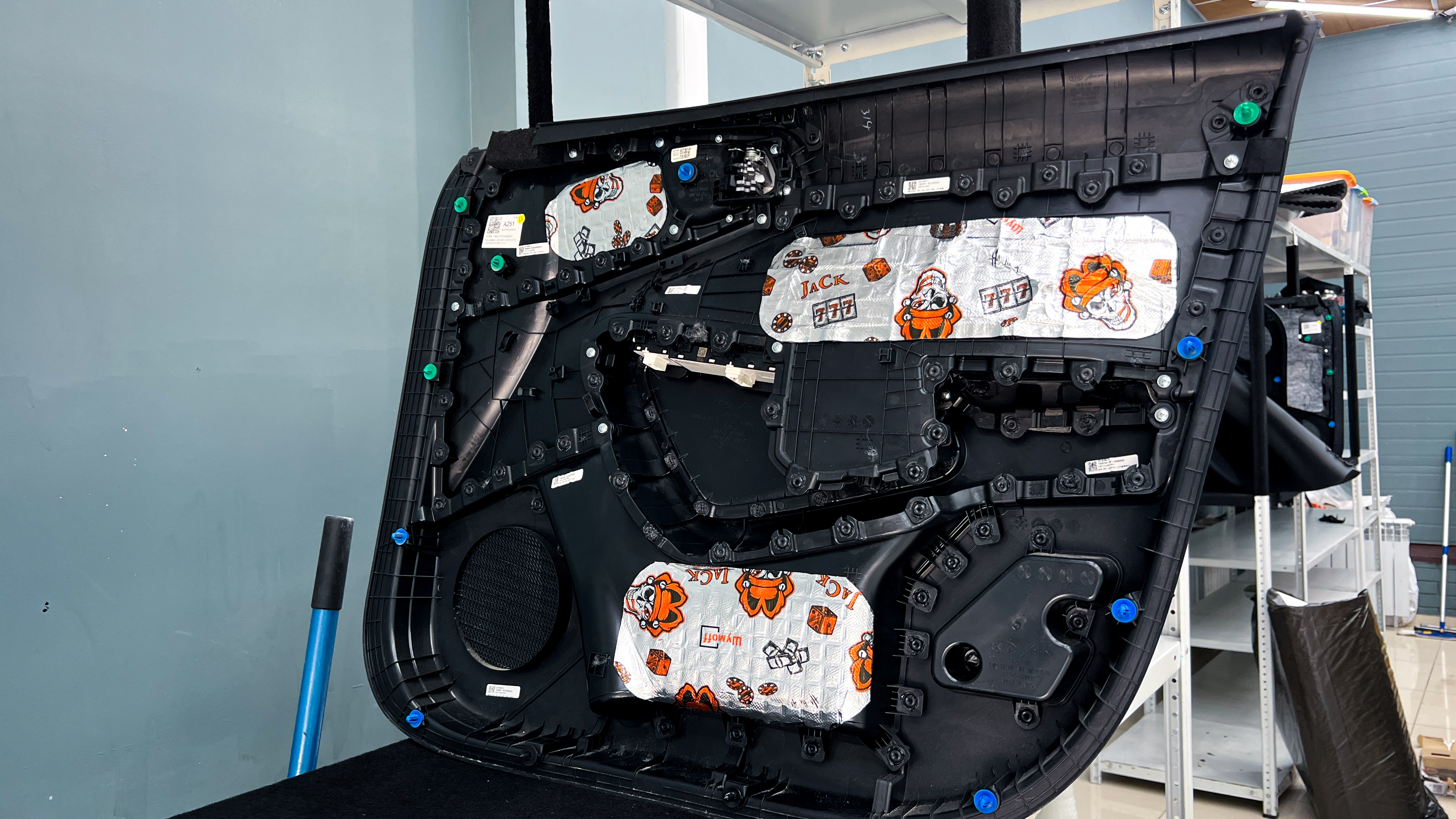 виброизоляция дверной обшивки Киа Соул Дверную обшивку изнутри частично оклеиваем виброизоляцией Шумофф Joker. Этот слой позволит придать обшивке необходимую сбитость тем самым не утяжеляя её.